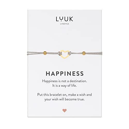 LUUK LIFESTYLE Bracelet textile filigrane avec pendentif cœur et carte HAPPINESS, porte-bonheur de voyage, idée cadeau pour petite amie, fiancée, Saint-Valentin, anniversaire, accessoire femme, or