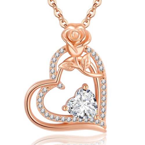 Tusuzik Collier Femme Argent 925 Collier or Rose Coeur Fleur avril Pierre de Naissance Pendentif Bijoux Femme Idee Cadeau Anniversaire Fete des Meres Noel Saint Valentin Cadeau Maman Copine Amie