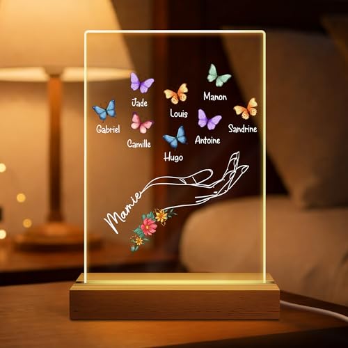 Cadeau Plus Veilleuse LED Personnalisée avec Prénom- Motif Papillon, Lampe en Acrylique et Socle Bois Personnalisée, Idée Cadeau Fête des Mères & Anniversaire pour Maman et Mamie (8 Enfants)