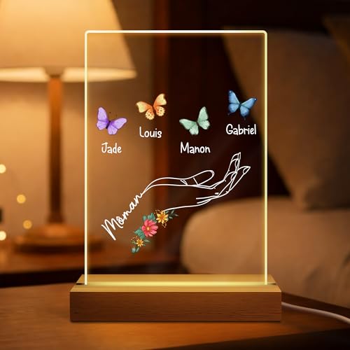 Cadeau Plus Veilleuse LED Personnalisée avec Prénom- Motif Papillon, Lampe en Acrylique et Socle Bois Personnalisée, Idée Cadeau Fête des Mères & Anniversaire pour Maman et Mamie (4 Enfants)