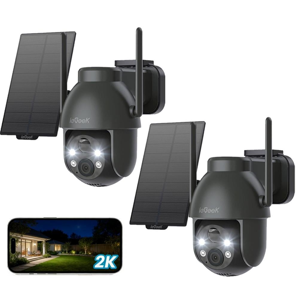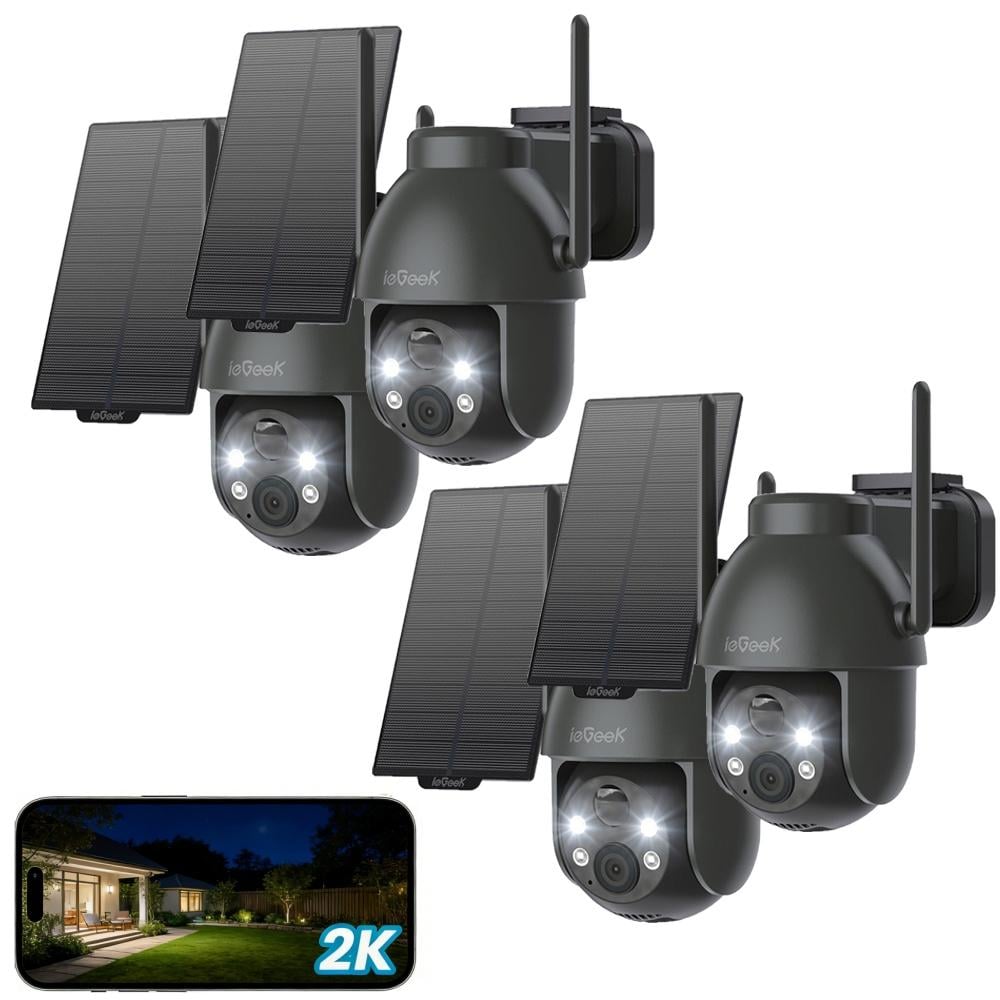 Caméra de surveillance ieGeek 2K Wi-Fi pour l'extérieur, sans fil, solaire, PTZ 360°, batterie rechargeable, 2,4 GHz, vision nocturne couleur, détection PIR, lot de 2