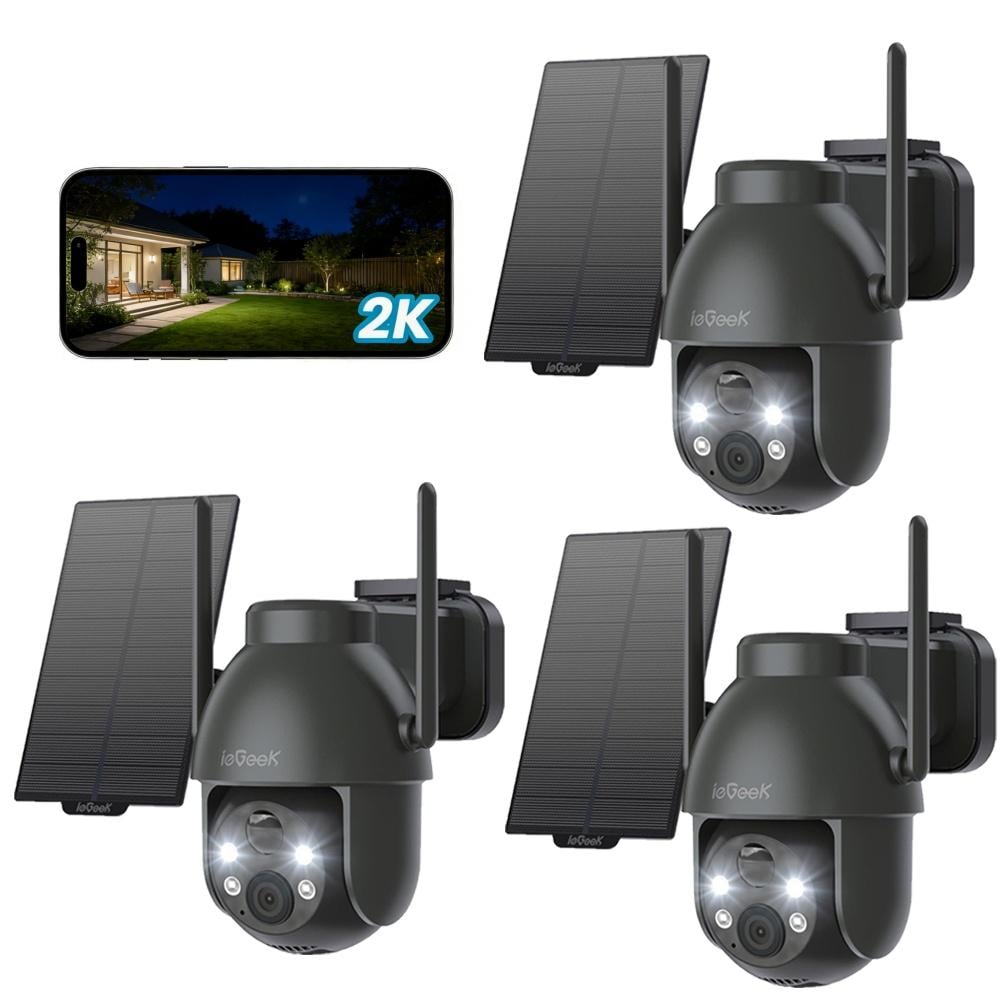 Caméra de surveillance extérieure ieGeek 2K WiFi, orientable à 360° (PTZ), alimentation solaire, vision nocturne couleur, audio bidirectionnel, détection PIR, alarme intelligente, lot de 3