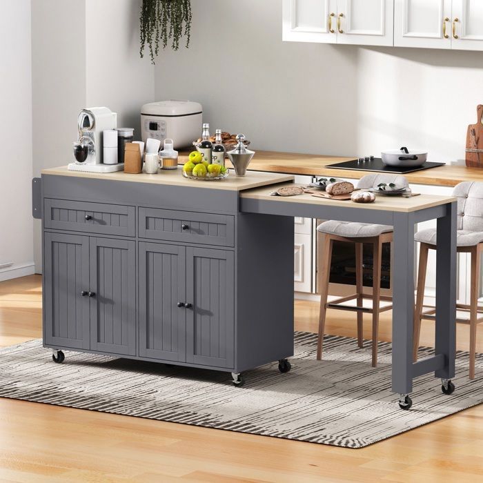 Desserte de cuisine à roulettes 129x46-71x91cm Îlot central Chariot de cuisine avec plan de travail extensible 2 gris et blanc