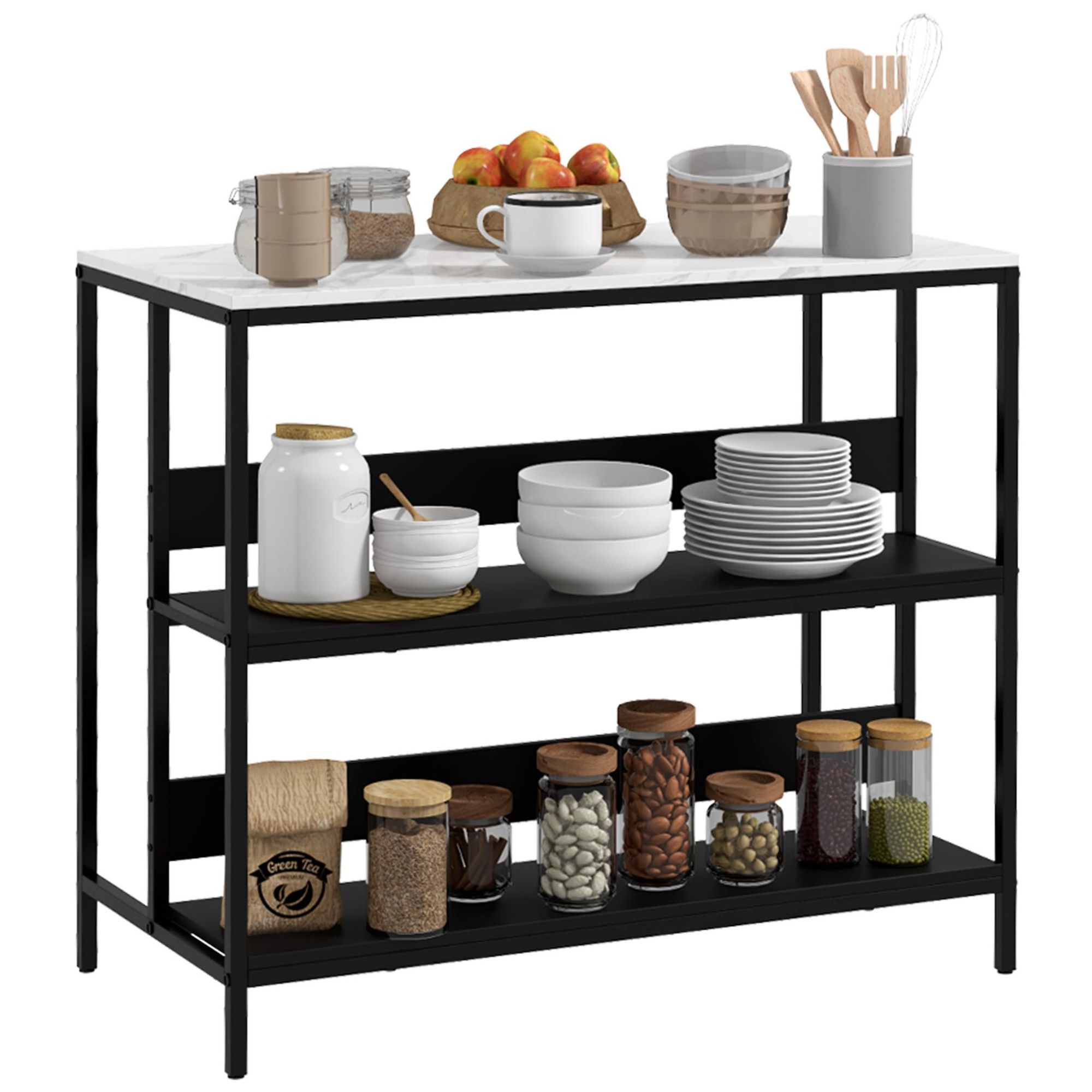 Îlot Central De Cuisine - 2 Étagères, Plateau - Dim. 100l X 50l X 90h Cm - Châssis Acier Panneaux Noirs Plateau Aspect Marbre Blanc