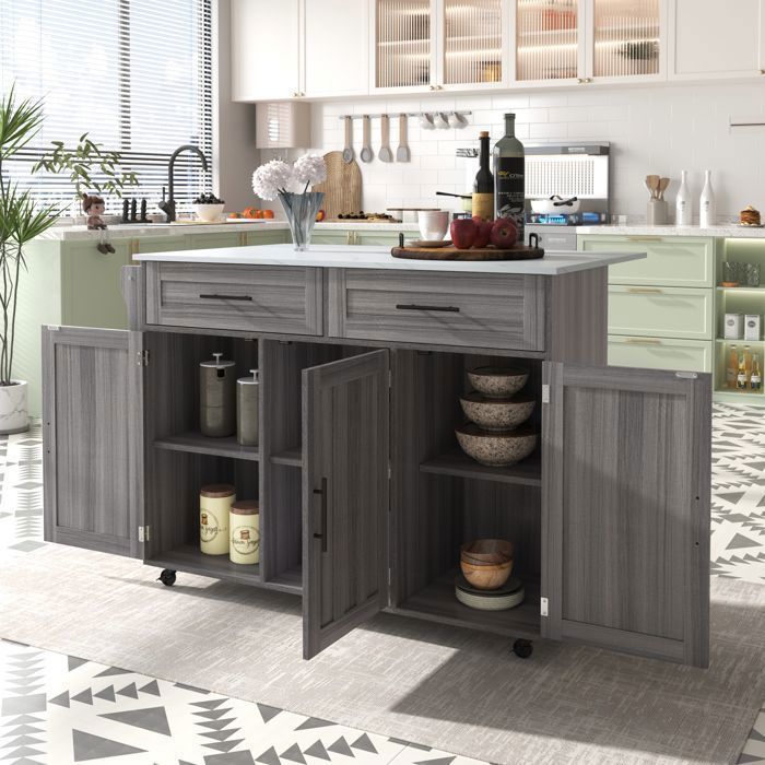 Ulife Îlot central gris chariot/buffet de table à manger avec armoire de rangement et 2 tiroirs pour la salle à manger