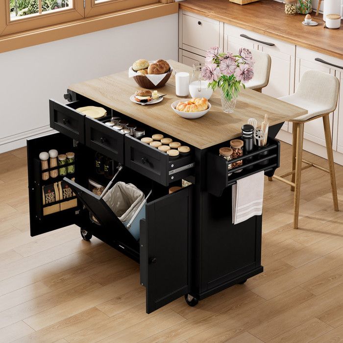 Desserte de cuisine en hévéa, ilot central cuisine avec plan de travail extensible rabattable (noir)