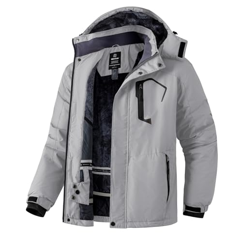 Wantdo Homme Veste de Ski Isolante Imperméable Veste Hiver Chaude Veste de Pluie Coupe-Vent Blouson de Ski Snowboard Veste d'hiver à Capuche Amovible Gris Clair L