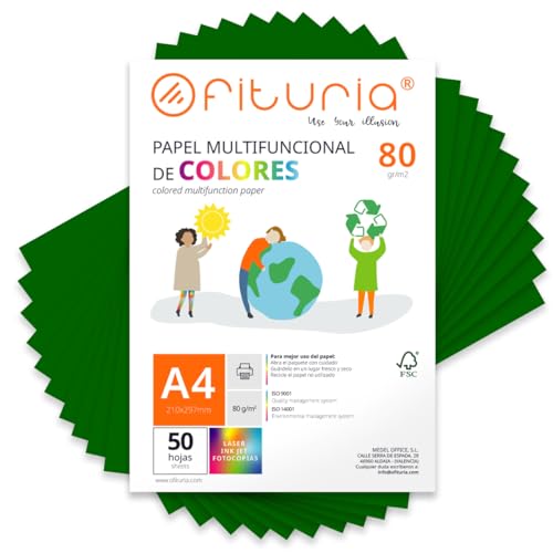 Feuilles de couleur, Pack 50 Feuilles A4 80gr – Papier couleur pour loisirs créatifs, imprimante, scrapbooking – Feuilles colorées – Idéal pour origami, pliage, bureau et école (Vert Oscuro, 50h)