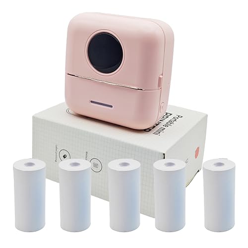 Zplumestarxx Mini imprimante portable en papier autocollant, mini imprimante autocollante, imprimante d'étude pour photos, compatible avec Android et iOS Bluetooth avec 5 rouleaux - Rose