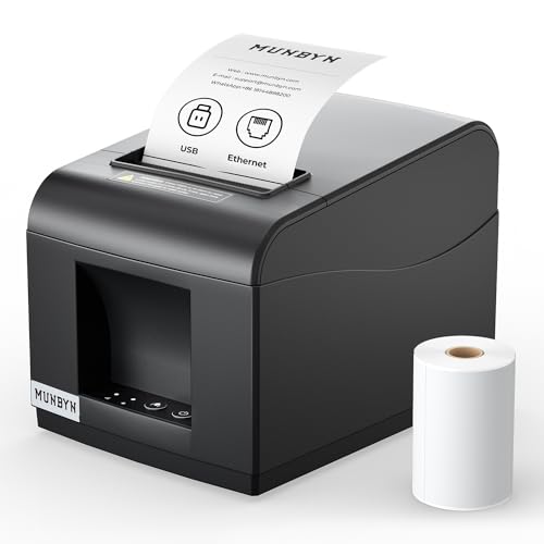 MUNBYN Imprimante de Reçus Thermique USB 80mm, Imprimante Ticket de Caisse Ethernet, POS de Cuisine de Supermarché avec Support de Coupe Automatique pour Windows/Mac/Linux, Command ESC, Noir
