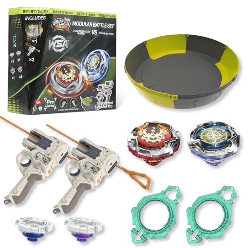 INFINITY NADO S7 Toupie avec 2 lanceurs modulaire & 1 arène modulaire, toupie en métal Type défense/Endurance Rotation Droite/Gauche, Ensemble de Duel Jouet pour garçons Filles 5+
