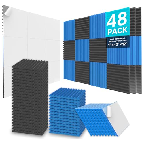 JBER Lot de 48 panneaux acoustiques en mousse, 2,5 x 30,5 x 30,5 cm, pour studio, insonorisation, ignifugés, forme crantée, dos adhésif, noir et bleu