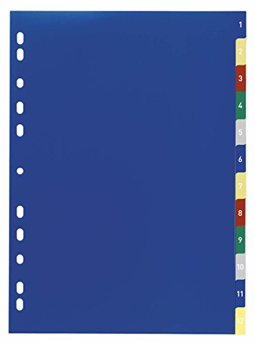 Durable 675027 Intercalaires Format A4 12 Touches Numériques 1-12 - Page de Garde - Perforations Universelles - Polypro 120 Microns 5 Couleurs Lot de 20