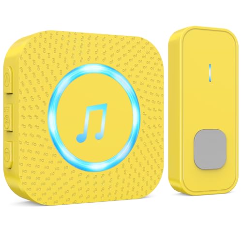 SURFOU Sonnette sans Fil Exterieur Étanche, Longue Portée 400M de Carillon Electronique Kit, 55 Mélodies au 5 Niveaux Volumes pour Maison, Indicateur LED Bleu (Jaune, 1 récepteur + 1 émetteur)