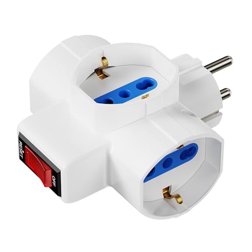 Ewent Triple Adaptateur de Puissance, Multiprise 3-en-1 avec Interrupteur on/Off, 3 Positions Universelles Schuko 10/16A, Schuko Fiche 2P+T 16A combinées aux Normes allemandes et françaises, 3500W