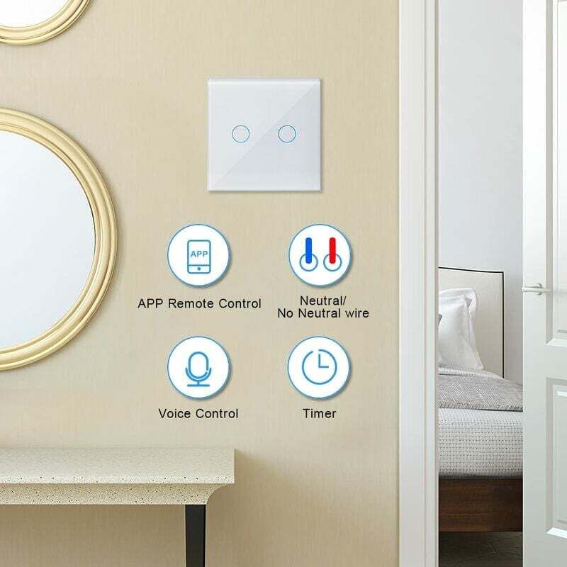 EaseSunny Interrupteur tactile intelligent 2 voies pour application Tuya Smart Life, commande vocale compatible avec Alexa, interrupteur mural WiFi 2,4 GHz, panneau en verre trempé, fil neutre et sous