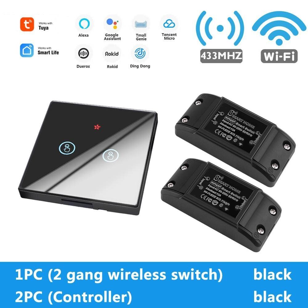 Interrupteur d'éclairage WiFi 220V RF 433 MHz avec disjoncteurs Module de retard de télécommande DIY Minuterie Interrupteur fonctionne avec Alexa Google Home, (1 pc) interrupteur sans fil 2 gangs + contr?leur 2 pc noir