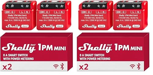 Shelly 1PM Mini Gen3 - Micromodule Relais Interrupteur connecté Wi-Fi & Bluetooth, Compteur de consommation, Commande à distance, 1 Canal 8A, Alexa & Google Home, App iOS, Android (Lot de 4)