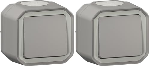 LEGRAND - Interrupteur Mural Etanche Simple ou Va-et-vient 10A Plexo - Commande d'Éclairage Complète Prête à Installer - Pose en Apparent - Fabriqué En France - Gris (Lot de 2)