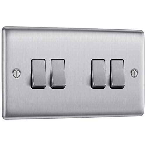 BG Electrical NBS44 Interrupteur mural quadruple 2 voies Profil surélevé et fin Bords arrondis Nexus Métal Acier brossé 20 A 16 AX