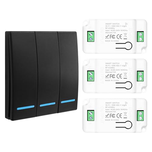 Interrupteur Sans Fil RF 433Mhz Va et Vient avec Contrôleur 10A - Installation Facile, Portée de 100 m - 1 Noir et 3 Récepteurs