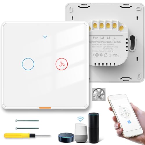 Acmerota Interrupteur d'éclairage intelligent WiFi, Interrupteur sans fil WIFI pour ventilateur extracteur de salle de bain Interrupteur sans fil 1 Gang(No Neutral) Compatible avec Echo & Google Home