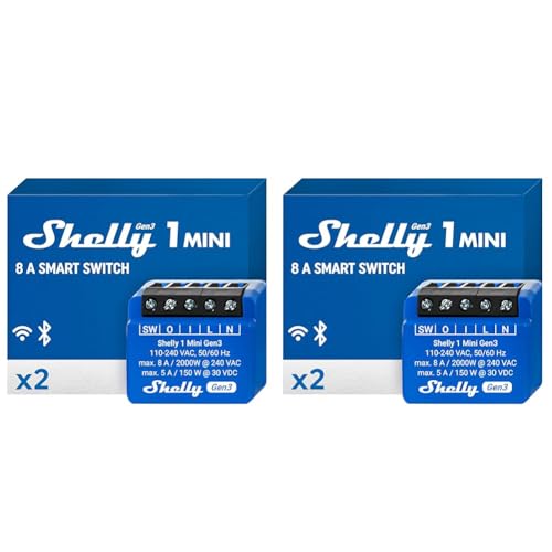 Shelly 1 Mini Gen3 - Mini Relais Interrupteur sans fil, Contacts secs, Wi-Fi & Bluetooth, 1 Canal - 8A, Commande portail, lumières, Alexa & Google Home, App iOS Android, Sans hub (Lot de 4)
