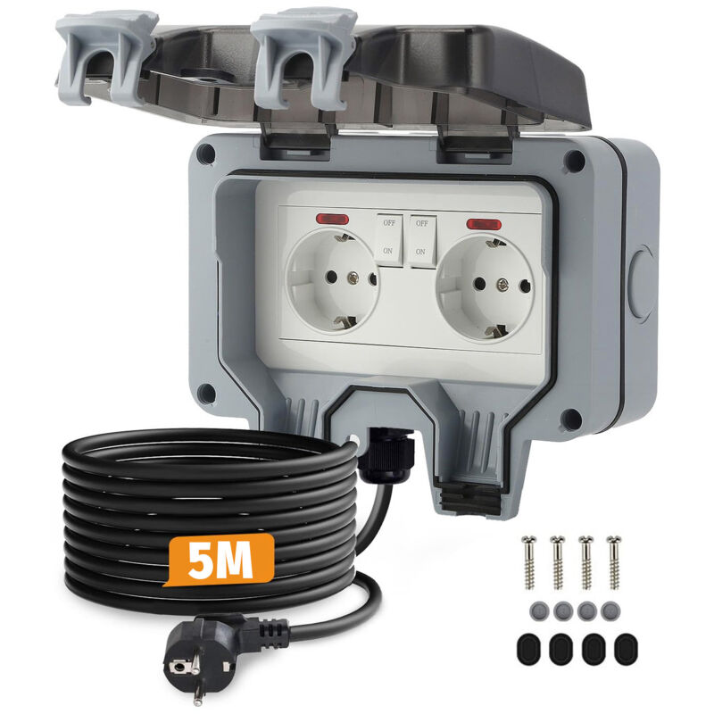 Prise électrique d'extérieur IP66, résistante à la pluie, à fixation murale, avec interrupteur indépendant et voyant lumineux, câble de 5 mètres /