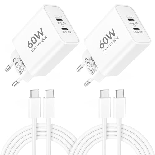 60W 2-Port Chargeur Rapide USB C pour iPhone 17 Pro Max Air, iPhone 16 16e 15 Pro Max Plus, iPad 10/11/A16 Generation, 40W USBC Chargeur PD Adaptateur Prise Charge Rapide + 2M Type C Câble 2-Pack
