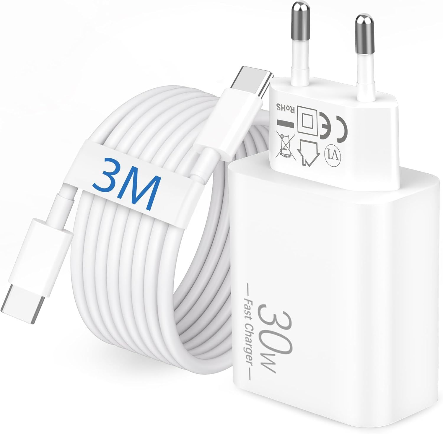 30W Chargeur Rapide avec USB-C 3M Long Câble pour iPhone 17/Air/16/16e/15 Pro Max Plus, iPad Pro/Air 13/11/12.9, iPad 10/11/A16, USBC PD Adaptateur Type C Charge Secteur Prise USB avec 2M Câble USBC