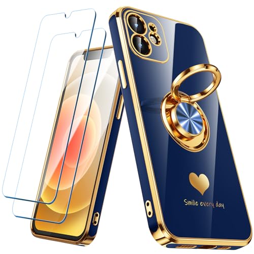 Nonional Coque Compatible avec iPhone 11 avec 2 Films protecteurs d'écran, Anneau Rotatif à 360°, Motif cœurs de Luxe - Coque de téléphone Fine et Souple à Bords dorés pour iPhone 11 - Bleu