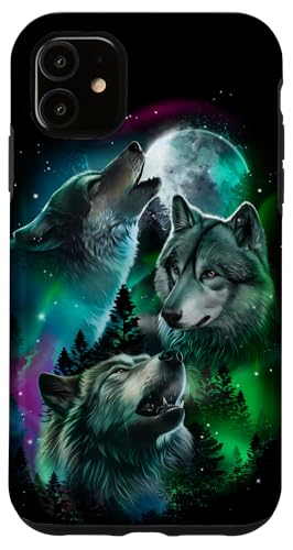 Loup gris chassant dans la forêt sous la pleine lune et aurore Coque pour iPhone 11