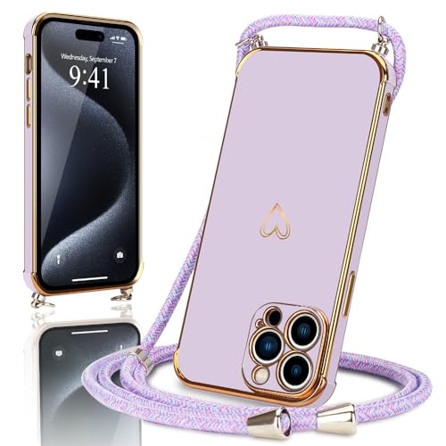 Micoden Coque pour iPhone 15 Pro avec Collier Réglable Case iPhone 15 Pro Silicone avec Motif Coeur d'amour Mignon Etui Housse avec Cordon Tour de Cou Lanière en Corde pour iPhone 15 Pro (Violet)