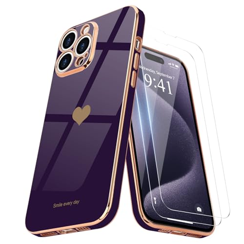 Teageo Coque pour iPhone 15 Pro avec 2 Films de Protection d'écran, TPU Galvanisé avec Motif Coeur d'amour Étui Antichoc pour Filles Femmes Housse pour iPhone 15 Pro, Violet foncé