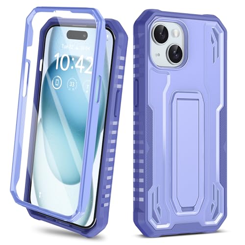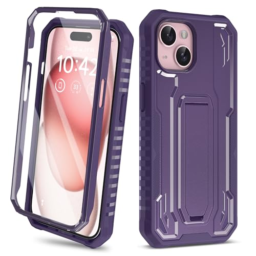 ORETECH [2 en 1 Coque pour iPhone 15 avec [Protection écran Intégré en Verre Trempé] et [Béquille] [Protection Antichoc Qualité Militaire] 360° Dos PC Bumper TPU Souple Coque iPhone 15 Violet Terne