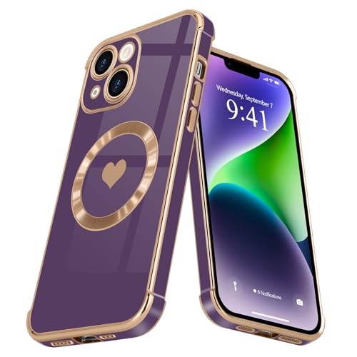 L-FADNUT Coque pour iPhone 15 Coque Compatible avec MagSafe Motif Cœur Galvanisé Antichoc Résistante Silicone Étui pour iPhone 15 Violet Foncé