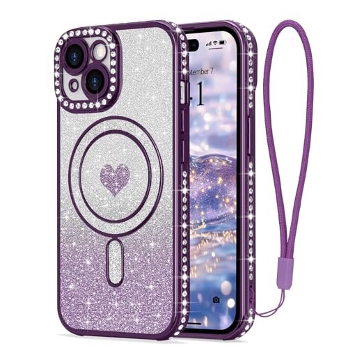 LAPOPNUT Coque pour iPhone 15 Compatible avec MagSafe Glitter Pailletés Carte et Bracelet pour Filles Femmes Bling Diamond Raised Lens Protection Coque pour iPhone 15 Violet