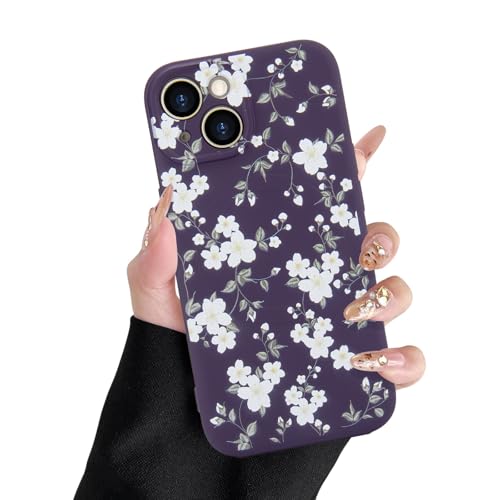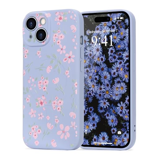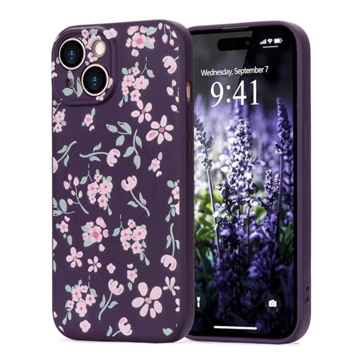 L-FADNUT Coque Magnétique pour iPhone 15 Etui Compatible avec MagSafe, Coque de Protection en Silicone Liquide de Haute Qualité Coque de à Motif Floral pour iPhone 15, Violet Foncé