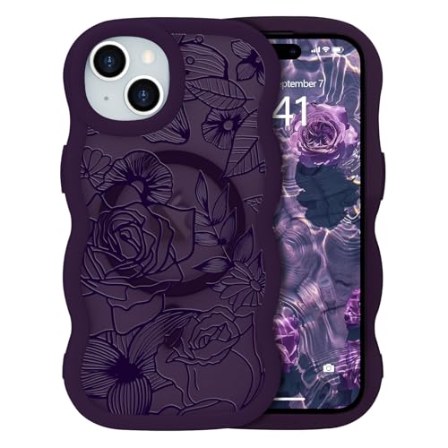 Wirvyuer Coque magnétique pour iPhone 15 Housse avec Motif Floral [Compatible avec MagSafe] Étui Antichoc en Silicone Coque pour Femmes Filles Cute Case pour iPhone 15 Violet Foncé