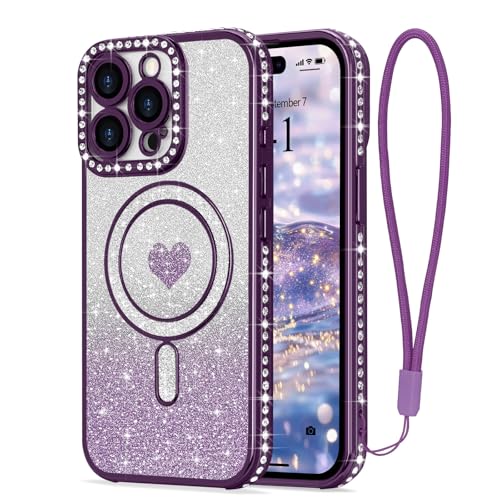 LAPOPNUT Coque pour iPhone 15 Pro Compatible avec MagSafe Glitter Pailletés Carte et Bracelet pour Filles Femmes Bling Diamond Raised Lens Protection Coque pour iPhone 15 Pro Violet