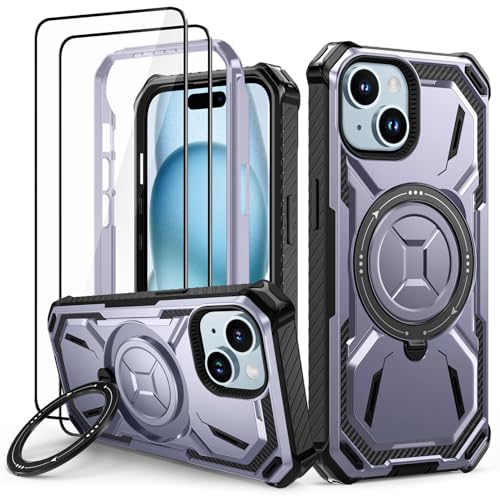 Lanhiem Coque iPhone 15 avec 2 Verre Trempé, Antichoc Étui de Militaire Protection, Anneau Support Renforcée Armure Etui pour iPhone 15 Housse, Violet