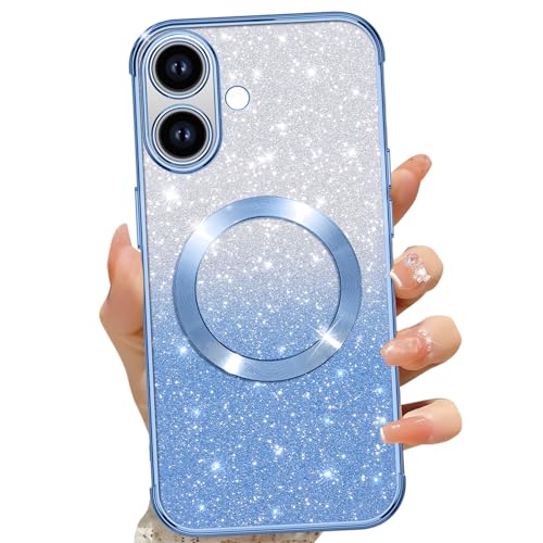 Phoona Coque Magnétique pour iPhone 16 6,1", Etui à Paillettes Compatible avec MagSafe, Antichoc Charge sans Fil Housse pour iPhone 16, avec 2 Verre Trempé, Bleu