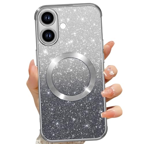 Kokio Glitter Magnétique pour iPhone 16 Con Cordon, [Compatible avec MagSafe] Antichoc Brillant Pailleté Housse Transparent Souple Coque pour iPhone 16 avec 2 Pièces Verre Trempé Étui, Argent