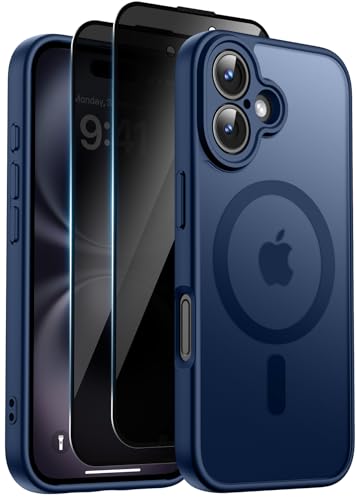 Helssitot Coque Magnétique pour iPhone 16 avec 2 Verre Trempé Anti-Espion Compatible avec MagSafe Militaire Étui Housse Antichoc Bumper Militaire 6,1 Pouces-Bleu