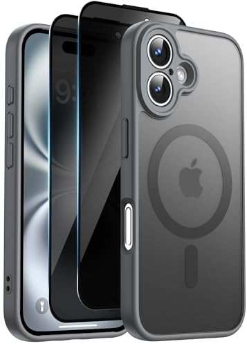 Helssitot Coque Magnétique pour iPhone 16 avec 2 Verre Trempé Anti-Espion Compatible avec MagSafe Militaire Étui Housse Antichoc Bumper Militaire 6,1 Pouces-Gris