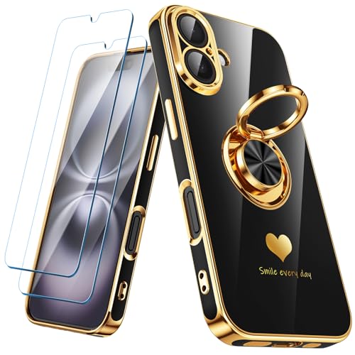 Nonional Compatible avec iPhone 16 avec 2 Films protecteurs d'écran, Anneau Rotatif à 360°, Motif cœurs de Luxe, Coque Fine et Souple pour iPhone 16 – Noir
