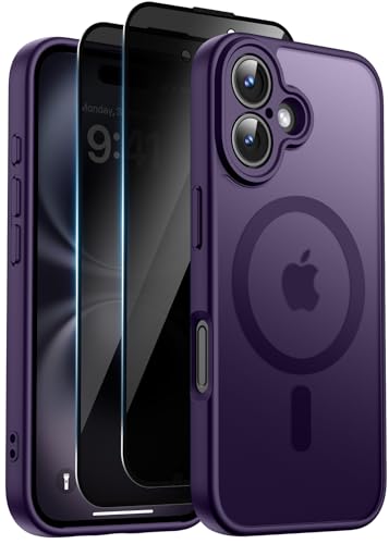 Helssitot Coque Magnétique pour iPhone 16 avec 2 Verre Trempé Anti-Espion Compatible avec MagSafe Militaire Étui Housse Antichoc Bumper Militaire 6,1 Pouces-Violet Foncé