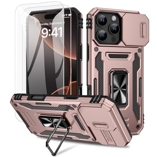 Doeshine Coque pour iPhone 16 Pro, 2 Protecteurs D'écran, et Anneau Béquille, [360° Protection Militaire] Protection Coulissante Caméra (Doré)