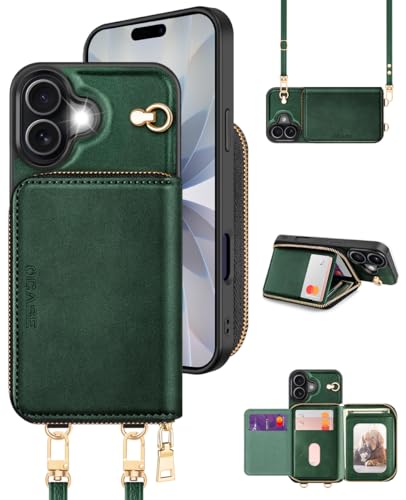 OCASE Coque Portefeuille pour iPhone 17, Étui Cuir à Fermeture Éclair avec Porte-Cartes RFID Blocage, avec Bandeoulière Détachable, Protection Antichoc Housse pour iPhone 17, Vert