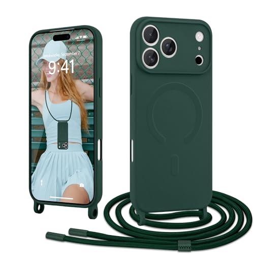 Ethanger Coque Magnétique pour iPhone 17 Pro avec Cordon de Collier Réglable Housse de Protection Compatible avec MagSafe en Silicone TPU Etui Case Ultra Fine pour iPhone 17 Pro Vert